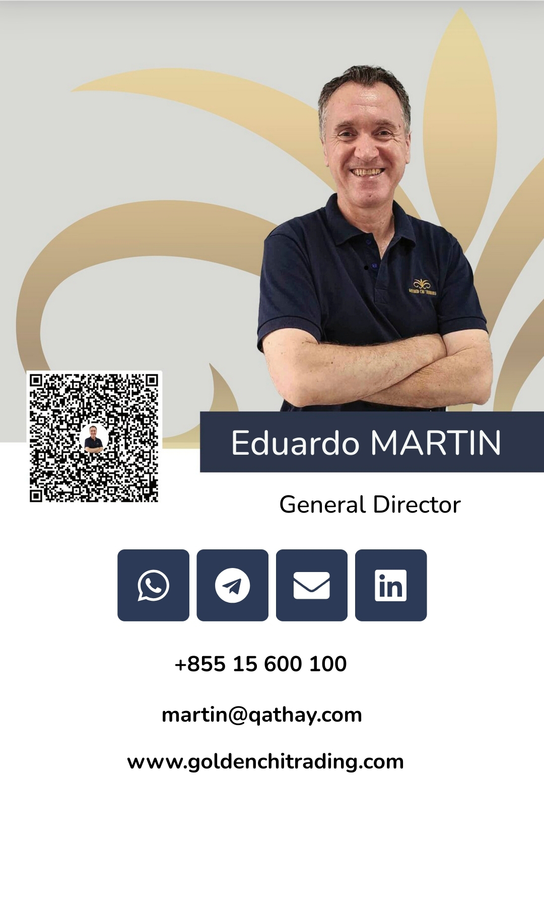 . . Eduardo MARTIN General Director Whatsapp Telegram Envelope Linkedin +855 15 600 100 martin@qathay.com www.goldenchitrading.com www.goldenchitrading.com Save Contacts . . . .